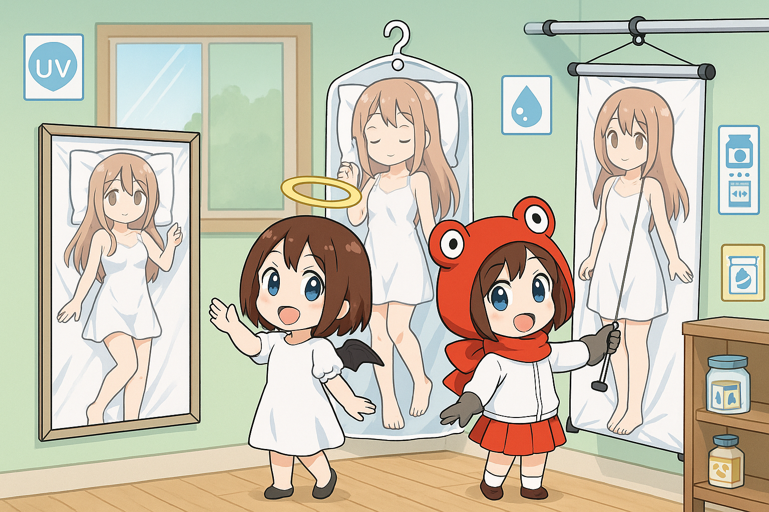 抱き枕カバーは置き場所で寿命が変わります。基本は直射日光を避け、窓から離れた内壁へ。北向き・東向きの壁は光量が安定し、退色を抑えやすいです。